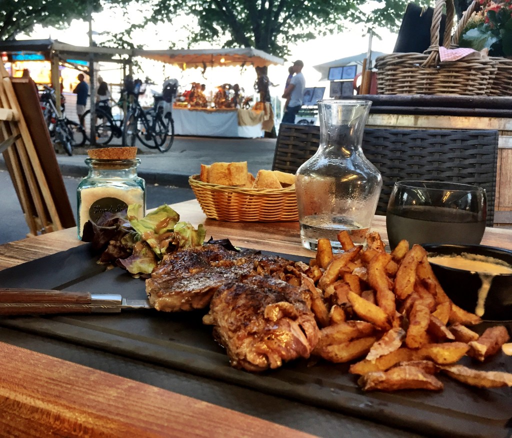 A walk around to the other side of the marina will take you to the fortress entrance, where for a small fee, you can make your way to the top to take in the view. There is also a ferris wheel that will get you to the same vantage point, but with a lot less effort. The entire horseshoe of the port is surrounded with small eateries and bars built with the purpose of providing the perfect backdrop to the lingering meal. Take the 15-20 minute walk and peruse the menus until you can agree on something that strikes your fancy. I was craving steak frites and found just what I was looking for on a fixed menu that included salad and a small desert at a restaurant on the right bank with outdoor seating. It was the perfect spot to unwind and listen to the locals take turns on the come and play piano, while the crowds swelled around it finishing up their Amorino gelatos from the shop next door.